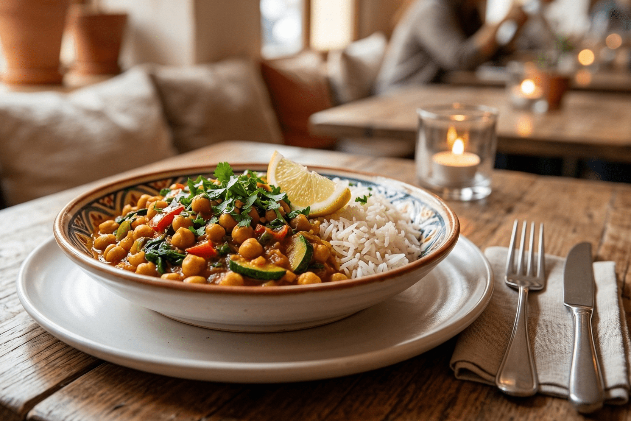 Curry de garbanzos con arroz basmati: alta saciedad, excelente margen, y percepción de plato elaborado que justifica un precio más alto.