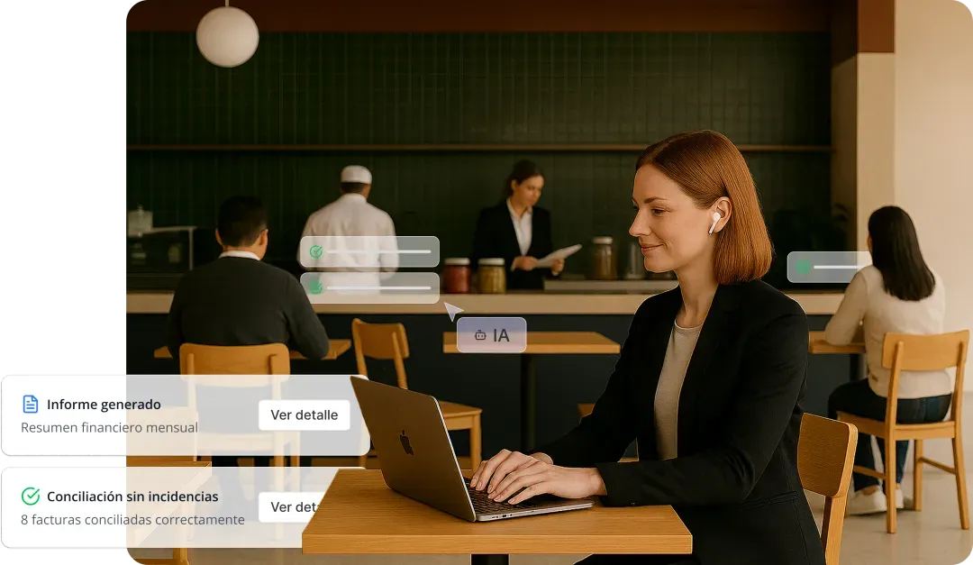 - Gestión automática de compras y documentación: Digitalización de facturas y albaranes, almacenamiento en la nube, conciliación automática, detección de incidencias y control de variaciones de precio.